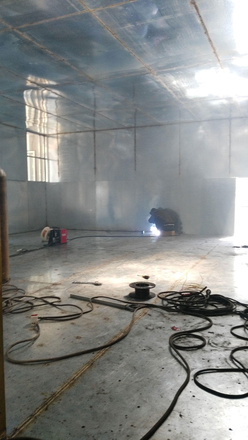 1、殼體:有六面板體、支撐龍骨及殼體與地面進(jìn)行絕緣處理,其中頂、墻板采用厚度為2mm的冷軋鋼板,地板采用厚度為3mm的冷軋鋼板;焊接工藝為CO,保護焊。